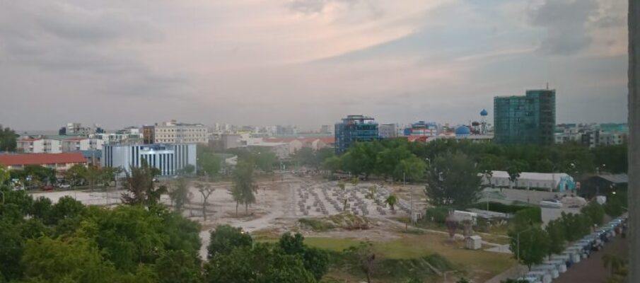 through a shattered window.